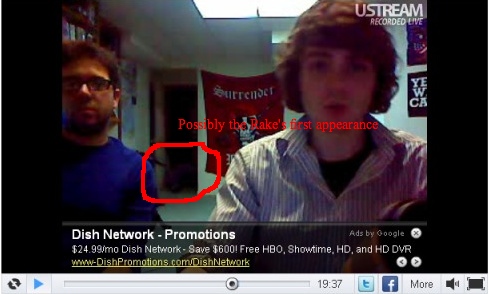 - It has been noted that in the UStream associated with Sleep Lab Part 1 that something can be seen crawling around the doorway into the darkened room at the rear just after 19:30; a couple of limbs emerge briefly, but move slowly back into the darkness, their movement being mildly reminiscent of the Rake's in "Cops Checked, No Body". Vince dons his Viking hat and goes to investigate (apparently in response to uStream viewers mentioning it), but comes back after a minute saying that he couldn't find anything. It has been speculated that this may in fact be the first appearance of The Rake in the series. Note that unlike The Rake's appearance in "Cops Checked" where it was clearly white, the creature seen in the Ustream seems to be wearing purple pants (reminiscent of The Purple Tape.) Other viewers have speculated that rather than The Rake, this is an appearance of HABIT.